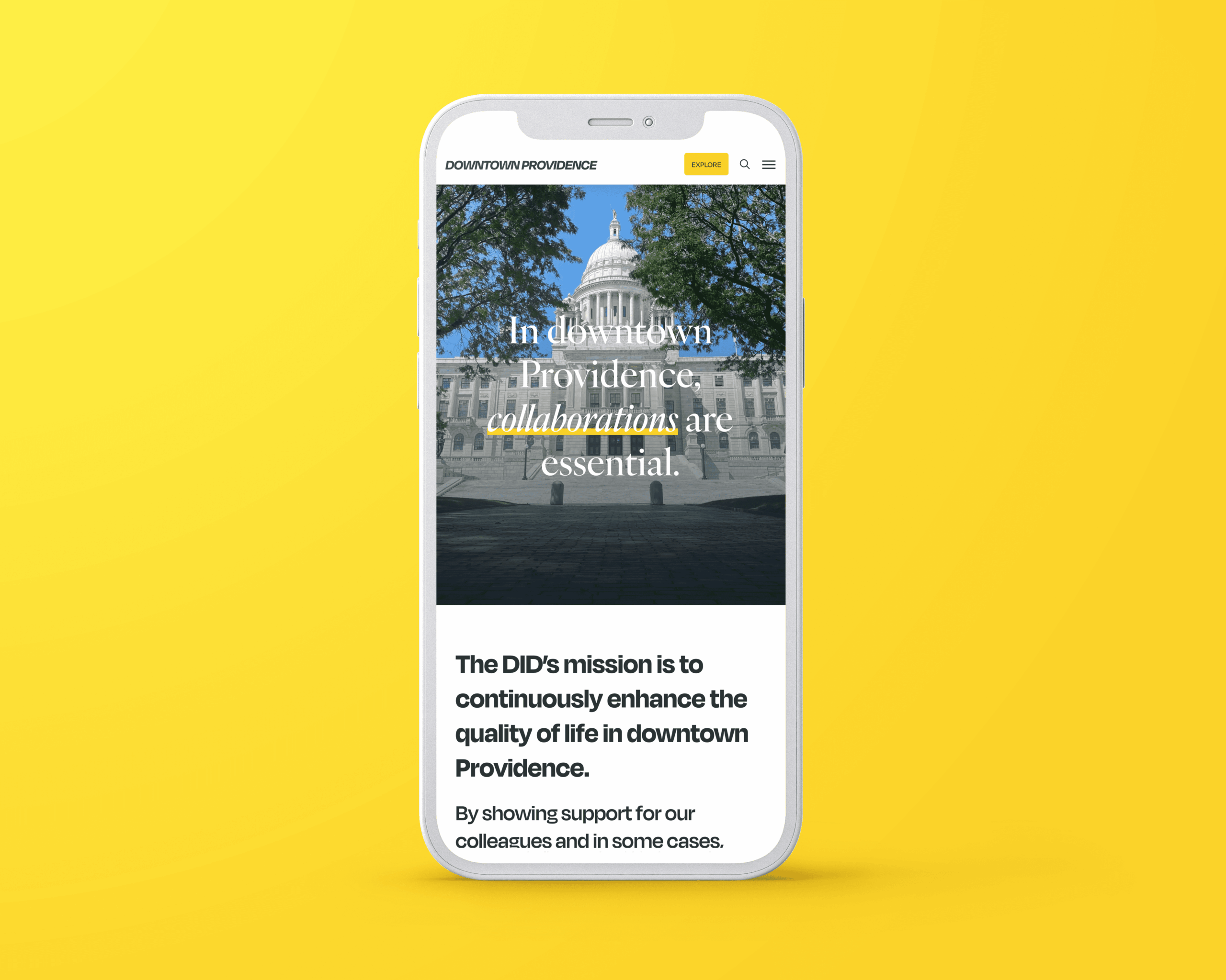 Mobile web design showing Downtown Providence site reading: "In Downtown Providence, Collaborations Are Essential."