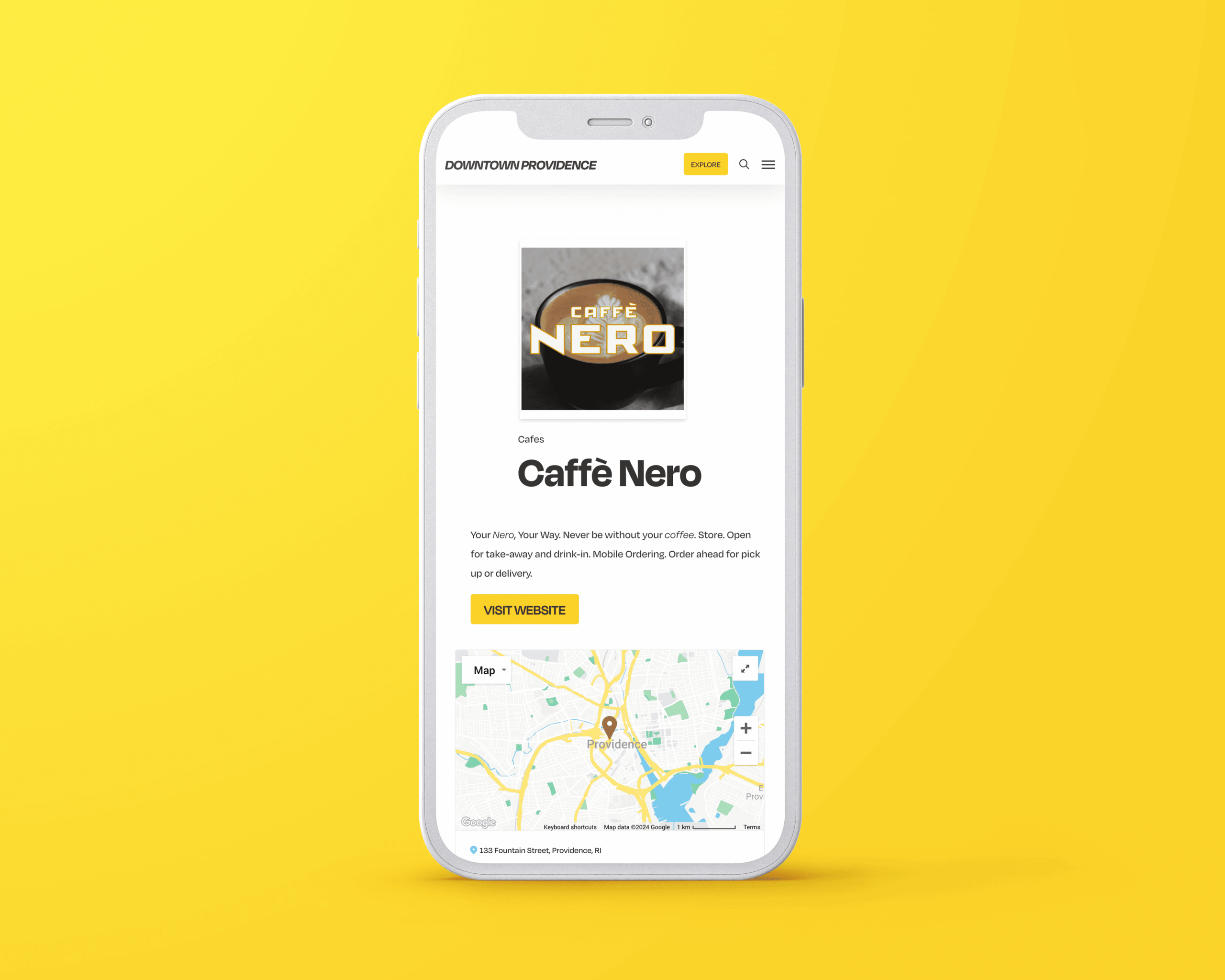 Mobile web design for Downtown Providence showing map location and ordering options on smartphone against yellow background.