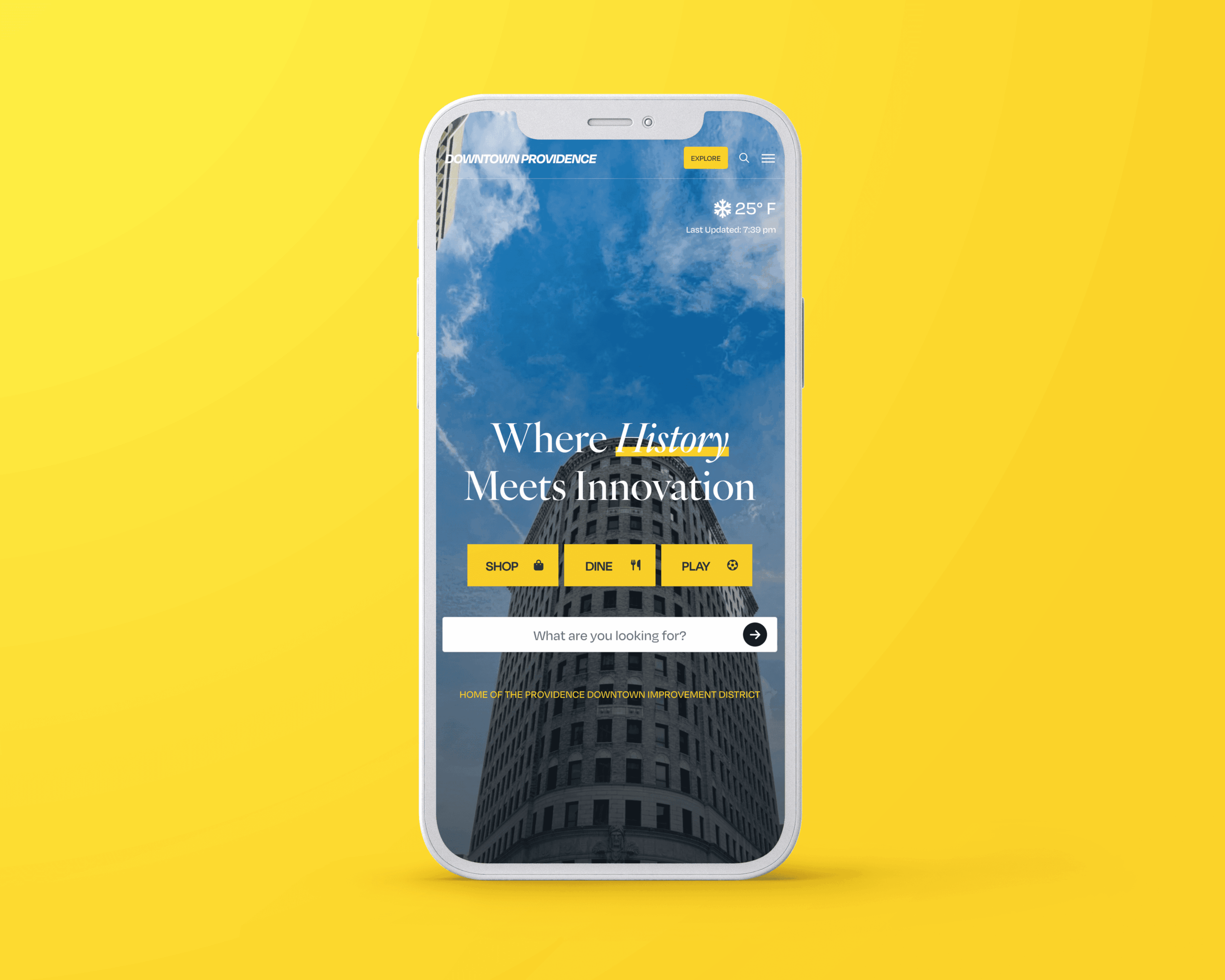 Mobile web design showcasing Downtown Providence site: "Where History Meets Innovation," with Shop, Dine, and Play options.