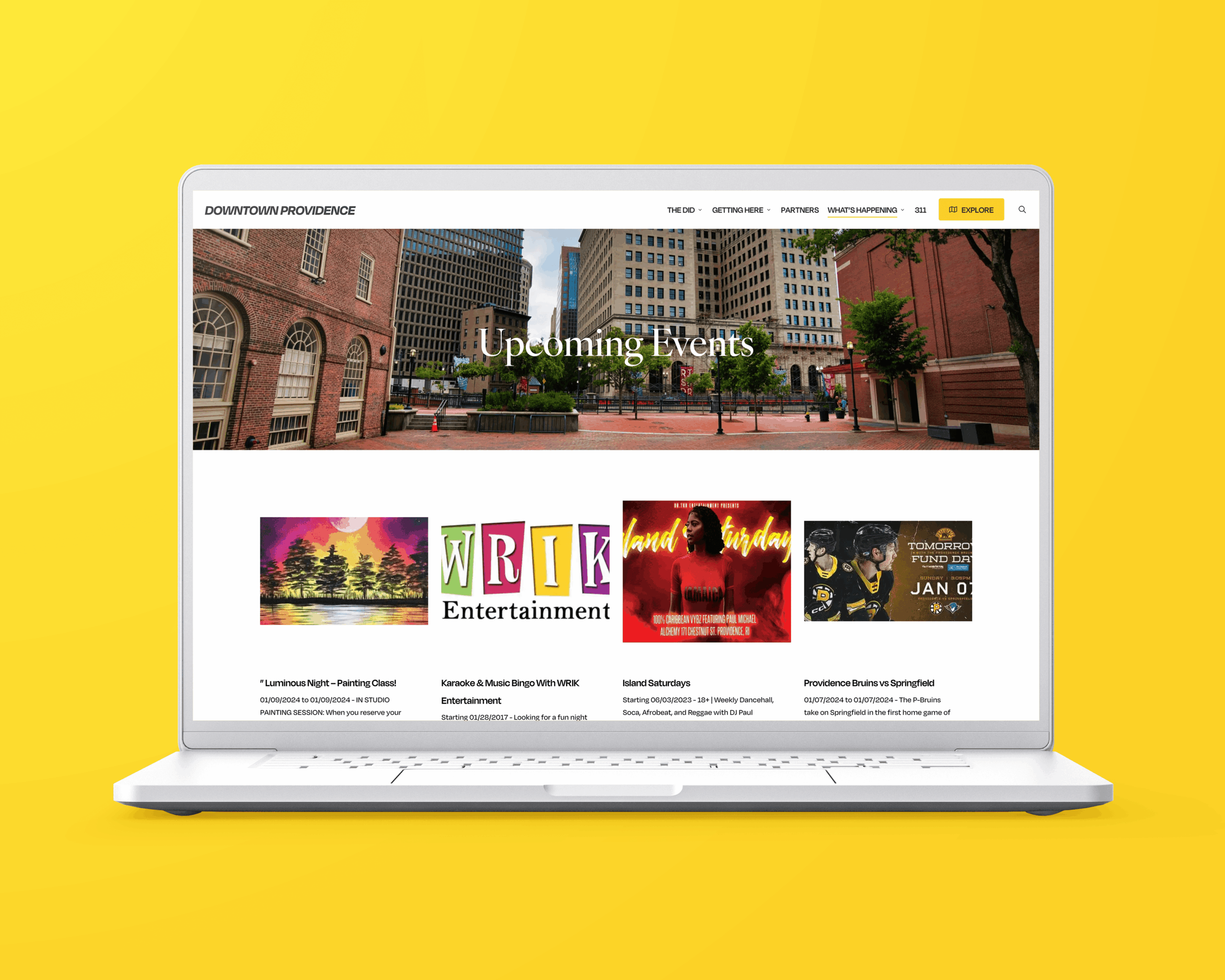 Laptop displaying Downtown Providence's Event Calendar with upcoming events, images, and details on a yellow background.