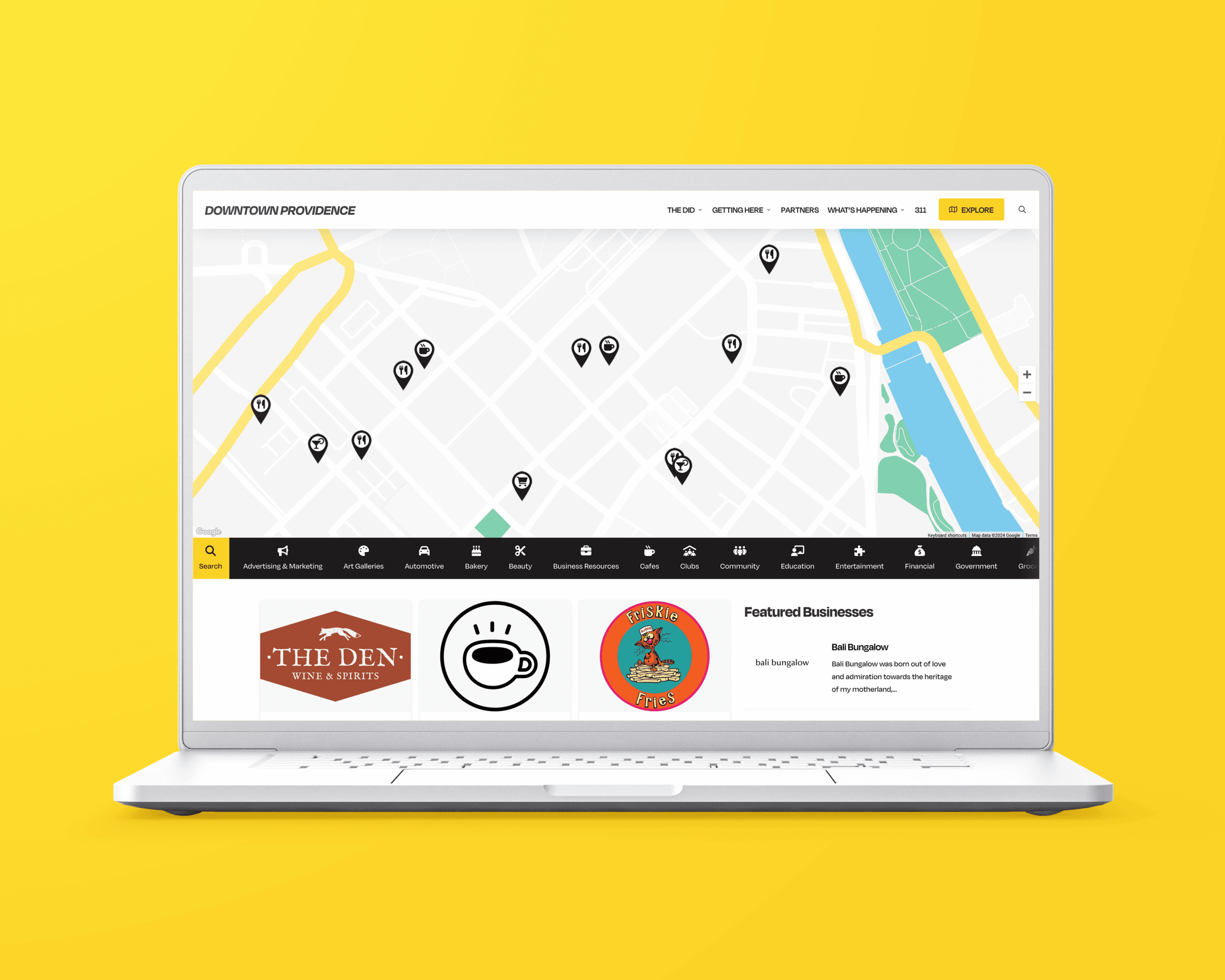 Custom-designed website showing Downtown Providence map with pins and featured businesses on laptop, yellow background.