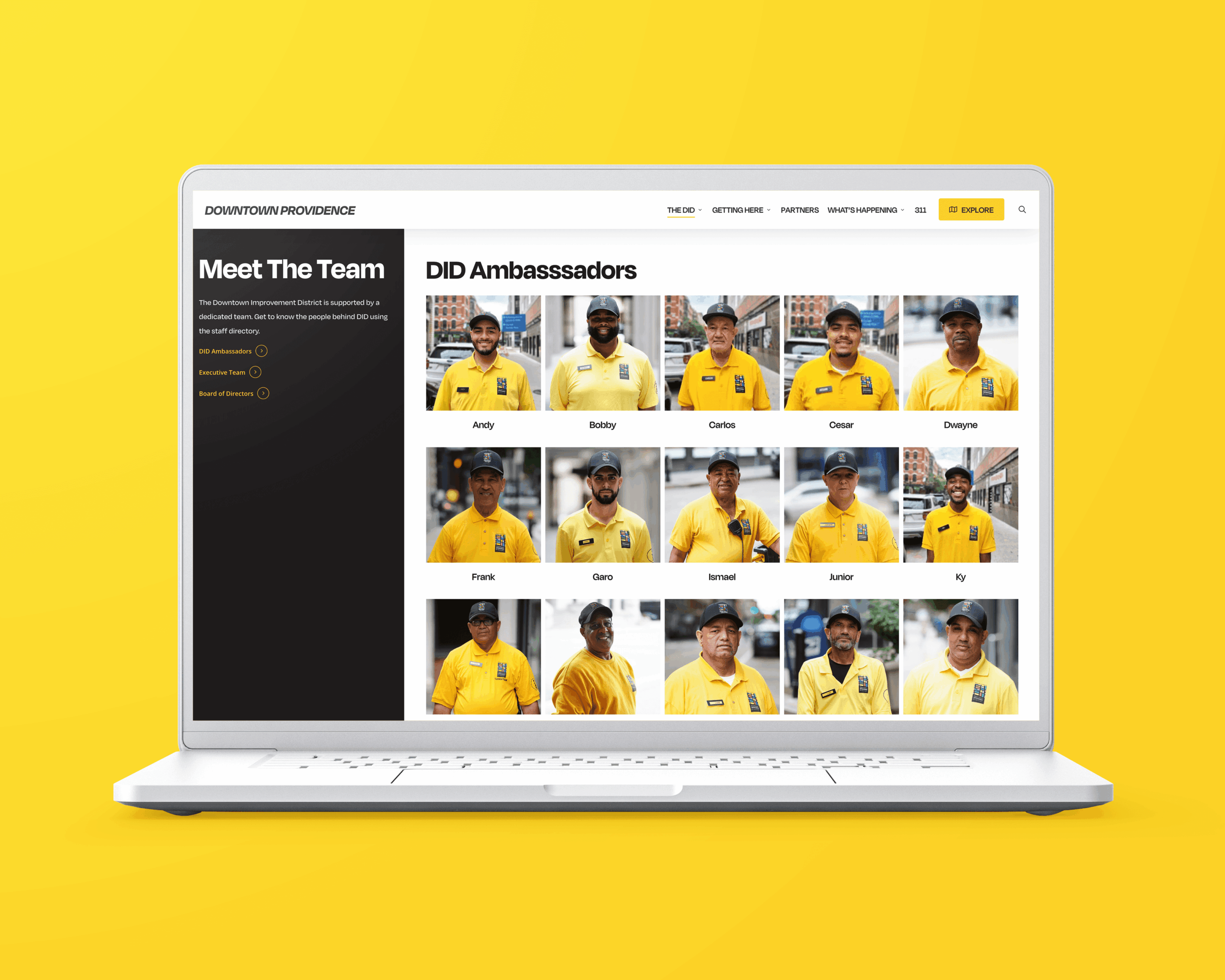 Laptop displaying Downtown Providence's custom website design with DID Ambassadors' photos on a yellow "Meet the Team" page.