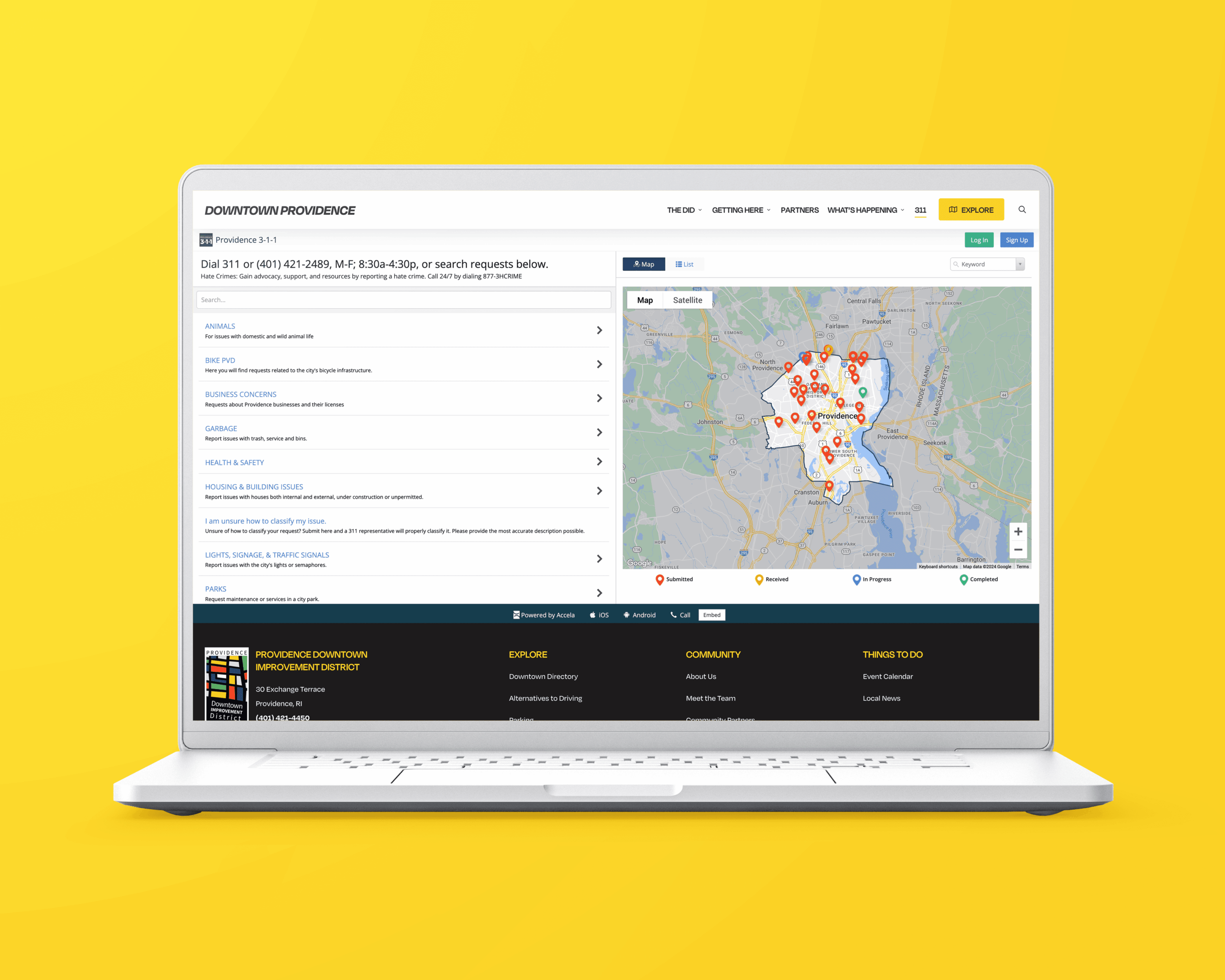 Laptop Showing Custom Website Design for Downtown Providence 311 Service Map and Request Options on Yellow Background